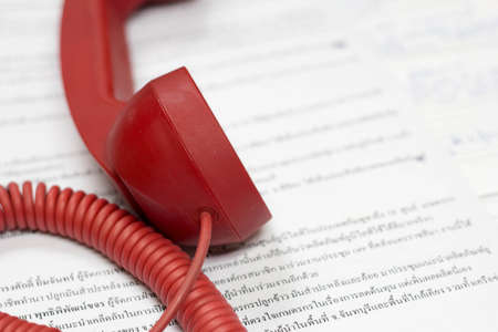 Profile side view closeup of woman hand holding and showing red call telephone handset receiver. Indoor studio shot isolated on yellow background.