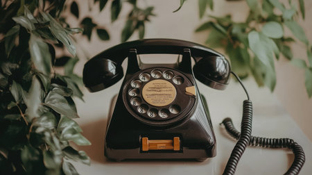 A vintage black rotary dial telephone rests on a table surrounded by greenery. This classic communication device adds a nostalgic touch to any decor. Perfect for vintage or retro themes.