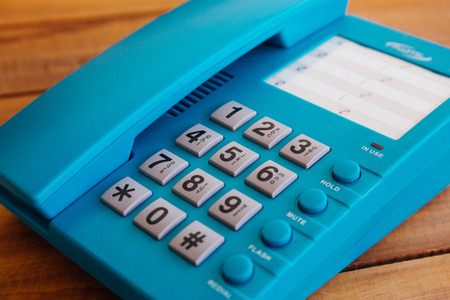 Rotary retro rotary telephone painted in blue paint on a yellow wall background. Creative layout