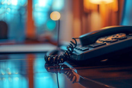 A classic black rotary telephone placed on a polished wooden desk, evoking a retro feel in a modern setting.. AI Generation