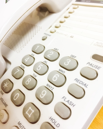 close up telephone landline at office background fo telecommunication technology and business concept