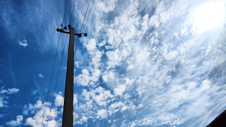 electric wire blue sky and white cloud background.