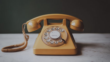 A nostalgic vintage landline phone with a rotary dial rests on a marble table, evoking memories of simpler times and classic design elements in a retro setting.