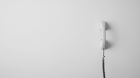 White telephone handset with black cord hanging on a white wall, conveying a sense of simplicity, minimalism, and anticipation or waiting for communication