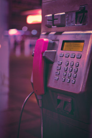 Vertical closeup shot of a public phone booth with pink handset in Duisburg, Germany