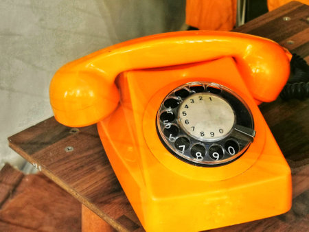 An old-fashioned rotary dial telephone in a vibrant orange hue is placed on a wooden table, showcasing its unique design and retro charm in a cozy indoor setting.