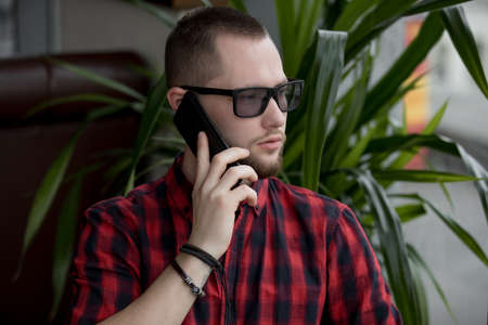 Portrait of man calls by smartphone sitting in cafe