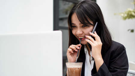 Asian business woman dringking coffe and talking on smartphone at cafe