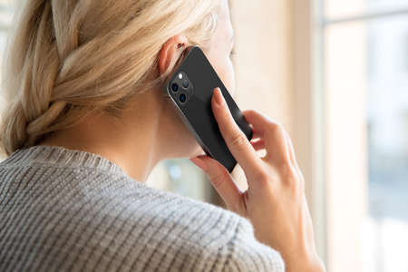 Young Caucasian woman talking on new model of smart phone.