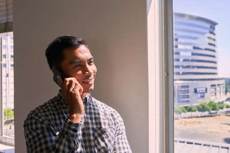 Joyful asian guy in eyeglasses talking on cellphone while working with laptop in office
