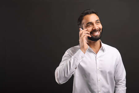 Happy bearded Indian man in formal white shirt talking on smartphone isolated on black background. Male office employee enjoying pleasant phone conversation, chatting on mobile