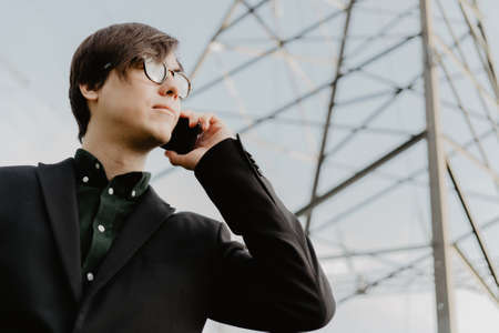 Fashionable male dressed in expensive outfit making a phone call at the city promenade