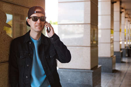 Millenial hipster guy in stylish outfit standing outdoor talking on smartphone