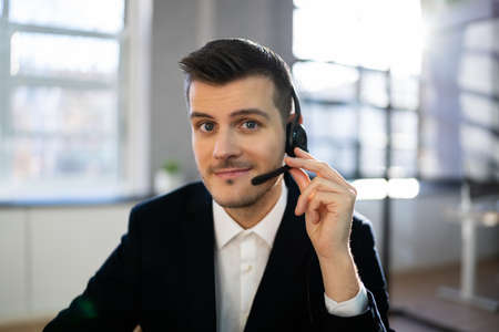 A man in the role of a call center manager, in an elegant suit, providing professional assistance.