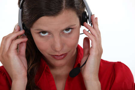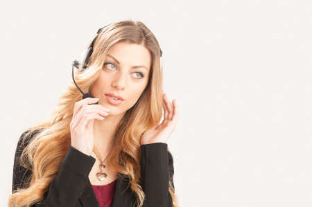 Half face portrait of a cute brunette call centre operator in a headset. She is isolated on a pure light background, looking above