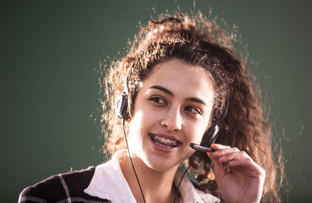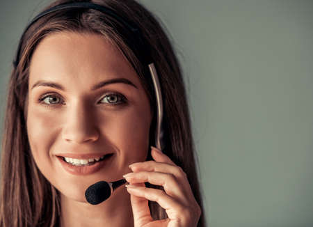 Beautiful business woman in headset is looking at camera and smiling, on gray background