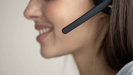Close up of smiling female call center agent wearing wireless headset consult client, positive woman sales agent or operator talk speak on helpline, customer support service, assistance concept