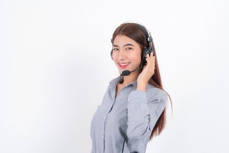 Portrait of happy smiling female customer support phone operator short hair, wearing a white shirt with headset standing one side holding the earphone isolated on white background.