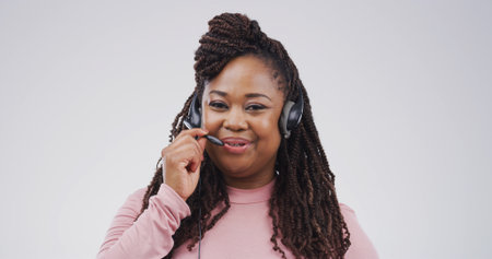Call center, headset and portrait of black woman on studio space for assistance, help or support. Contact us, customer service and microphone with happy virtual assistant isolated on white background