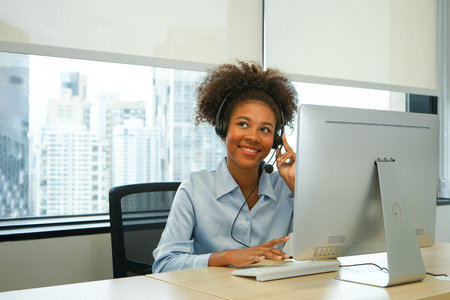 portrait the african american female wear headsets is working in a call centre, business woman operator agent is answering phone online