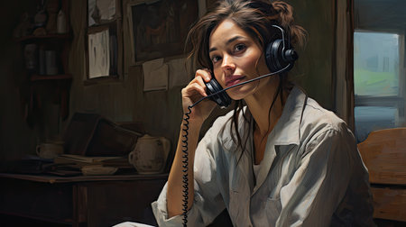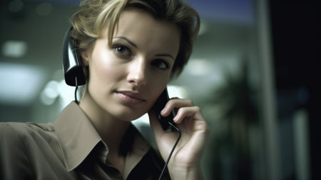 Sales representative Female Caucasian Young adult Talking on the phone in Office. Generative AI AIG22.