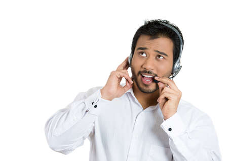 Closeup portrait of male customer service representative or call centre worker or operator or support staff speaking with head set, isolated on white background
