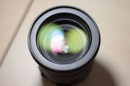 Camera lens with lense reflections. Lens for SLR Single Lens Reflex Camera. Modern digital SLR camera. Detailed photo of a classic wide aperture portrait lens.
