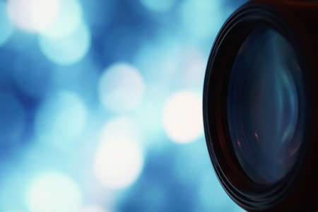 Camera lens close-up macro shot showing aperture blades. Media and photography concept background.