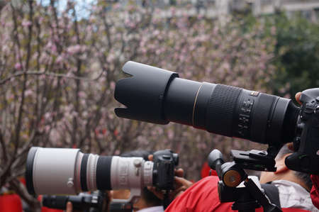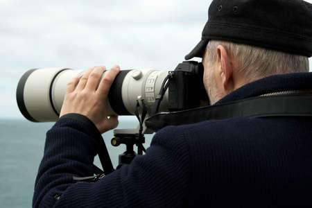 Young, male photographer taking photos with his huge, new, shiny, fast prime professional telephoto lens