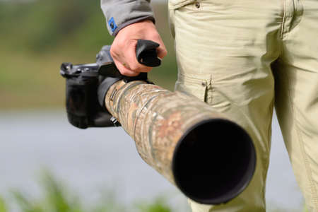 Landscape photography. A cut-off image of an adult male taking photos with a camera with a telephoto lens. The lens is supported by a monopod.