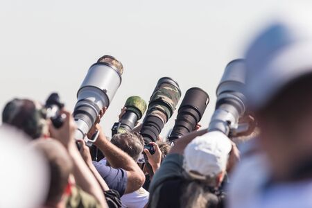 29 AUGUST 2019 MOSCOW, RUSSIA: Photographers taking photos of the airplanes - many professional lenses are directed up