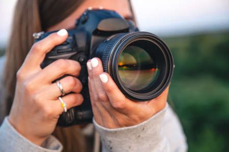 woman holding a camera with a lens in nature in the mountains and the sea in the background