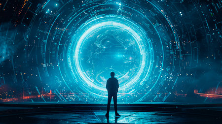 A lone man stands in a dark room, surrounded by stunning holographic projections and glowing graphics that create an immersive digital environment.
