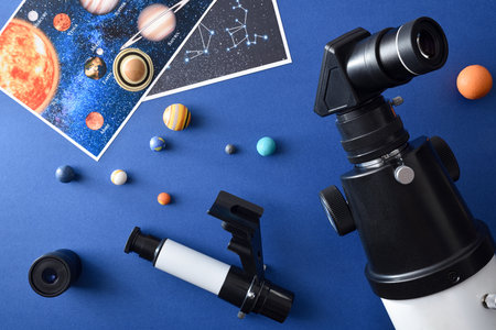 Eyepiece mounted on a telescope and blue background with and planets. Top view.