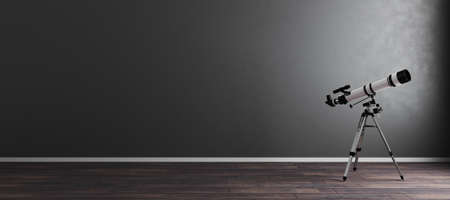 Telescope in modern dark gray room interior background, astronomy concept, telescope in empty room, mockup, 3d render