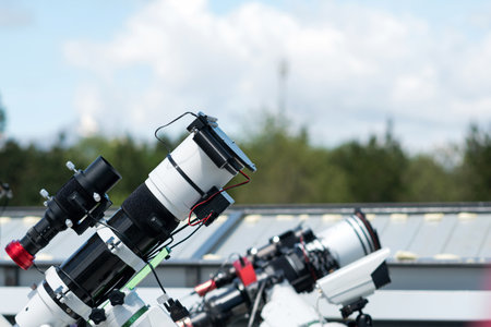 Close-up of telescopes on rooftop with cloudy sky background.