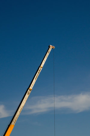 close up at top beam of crane mobile on background of blue sky