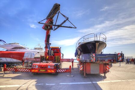 Drager, Denmark - May 02.2013: Big crane launches private boat