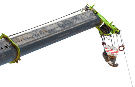 Crane boom with isolated hook, blue sky background,Elements of crane: hook, loop, chain, connecting parts