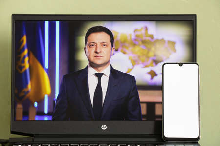 Ukraine Dnepr 03/06/2022 - Portrait of the President of Ukraine Volodymyr Zelensky on a laptop as a background and a phone with a white screen.News from the president in every home