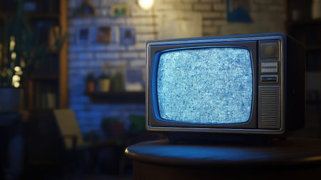 Vintage television set with a static screen in a retro-style room, creating a nostalgic atmosphere. Ideal for themes related to vintage, retro, and classic media.