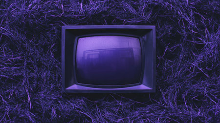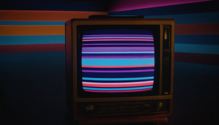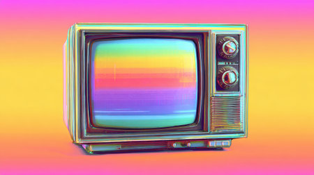 A vintage television set sits against a vibrant colorful background. The screen displays a playful static pattern that captures the retro aesthetic. This scene evokes nostalgia for classic media.