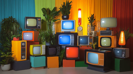Explore a vibrant assembly of retro televisions in a colorful home setting capturing nostalgic vibes.