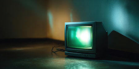 Old CRT monitor glowing green light in dark room corner with shadow and reflection on floor
