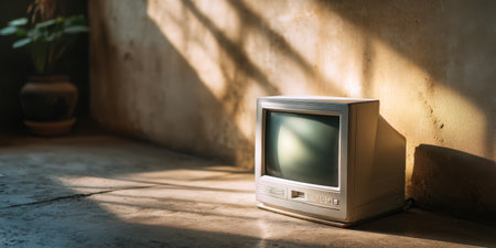 Vintage CRT monitor on concrete floor with sunlight casting shadows on textured wall