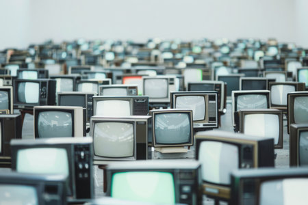 A creative arrangement of vintage televisions displaying static noise, highlighting retro aesthetics and the evolution of media technology in a minimalistic setting.