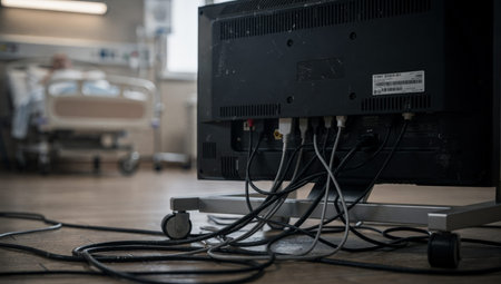 A realistic view of the back of a medical monitoring station with tangled black wires focusing on the analog aesthetics and the complex authentic infrastructure supporting healthcare innovation.