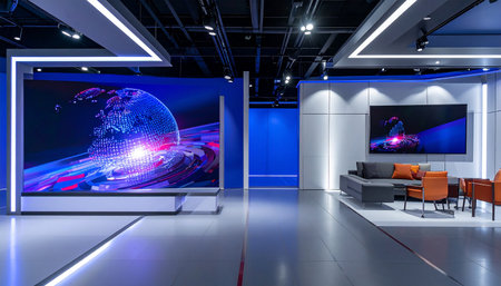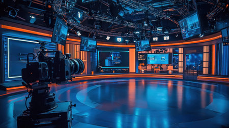 A vibrant television studio with advanced equipment and a modern design, perfect for news, talk shows, and live broadcasts.