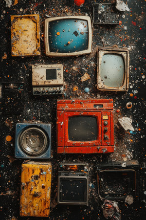 Pile of vintage televisions on an electronic waste mountain, symbolizing tech obsolescence