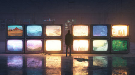 A collection of vintage televisions illuminating a dimly lit room. Each screen displays vibrant colors, creating a nostalgic and artistic atmosphere perfect for media enthusiasts.